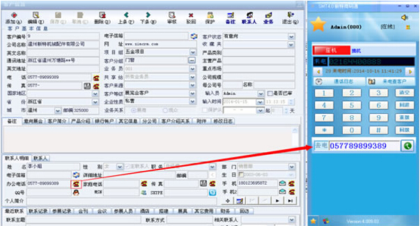 分派到业务员手里的客户,在客户信息页面中,只需要点击电话号码旁的呼出按钮即可可进行一键拨号操作,通过展之通控制电话线路自动呼出,提高电话营销工作效率。