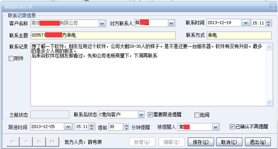 电话挂机生成通话日志时,CRM里同时可以自动生成联系记录,然后业务员补填详细的联系情况和客户状态标记等。可以设定下次跟进时间,到时会自动提醒业务员。