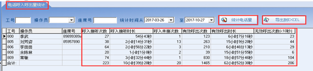统计某时间段各工号呼入和呼出电话数量、时长等并,结果可导出EXCEL,双击可以打开通话记录明细。