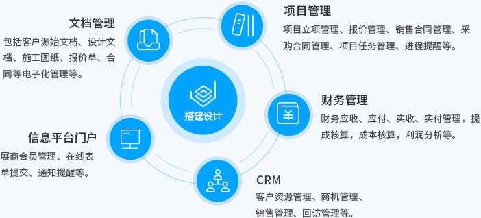 将CRM、项目管理、财务管理、文档管理、信息门户平台等与搭建设计管理特点有机结合。