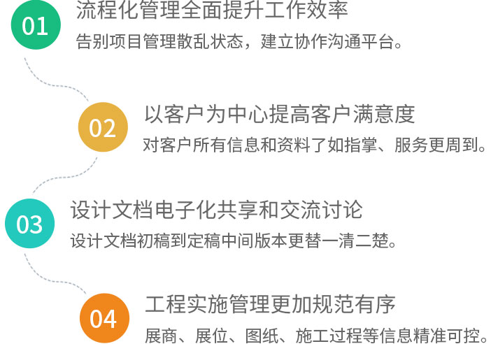 将展商、销售、设计师、主管、财务等通过信息门户平台协同办公,统一处理客户资源、销售进程 、服务进程、财务信息、成本核算等。